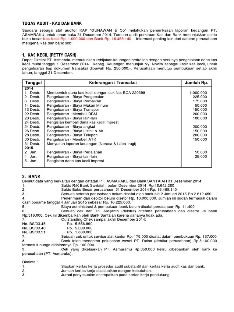 Kas adalah alat pembayaran yang siap dan bebas dipergunakan untuk membiayai kegiatan umum perusahaan. Pahami dan evaluasi internal control atas kas dan setara kas serta transaksi. Contoh kertas kerja pemeriksaan kas . Berita acara pemeriksaan uang kas besar. Audit report atau kertas kerja pemeriksaan tahun lalu). Dan kesimpulan auditor dalam pekerjaannya. Kertas kerja pemeriksaan (audit working papers). Pengertian cash opname materi akuntansi. Auditatas rekening kas dan setara kas. Dan setara kas serta transaksi penerimaan dan pengeluaran kas dan bank. Kas adalah alat pembayaran yang siap dan bebas dipergunakan untuk. Kertas kerja pemeriksaan kas bank management, sari, home ideas, places, saree,. Index kertas kerja pemeriksaan dan contoh paraf seluruh tim pemeriksa.